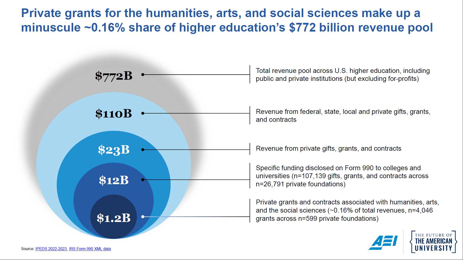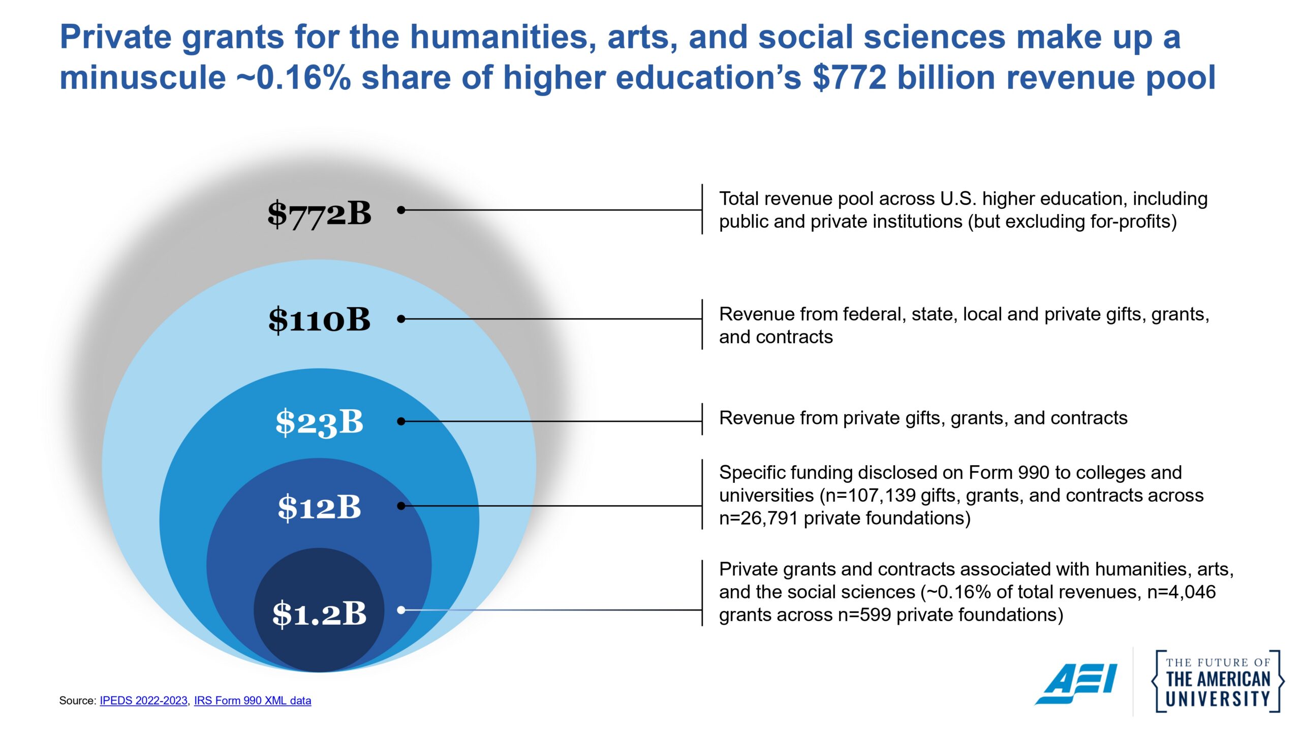 A surprisingly small stream of private money may play an outsized role in shaping academic culture in American higher education. Out of higher education’s $772 billion revenue base, just 0.16% of that, or roughly $1.2 billion per year, flows to the humanities, arts, and social sciences (HASS) from U.S.-based foundation funding.