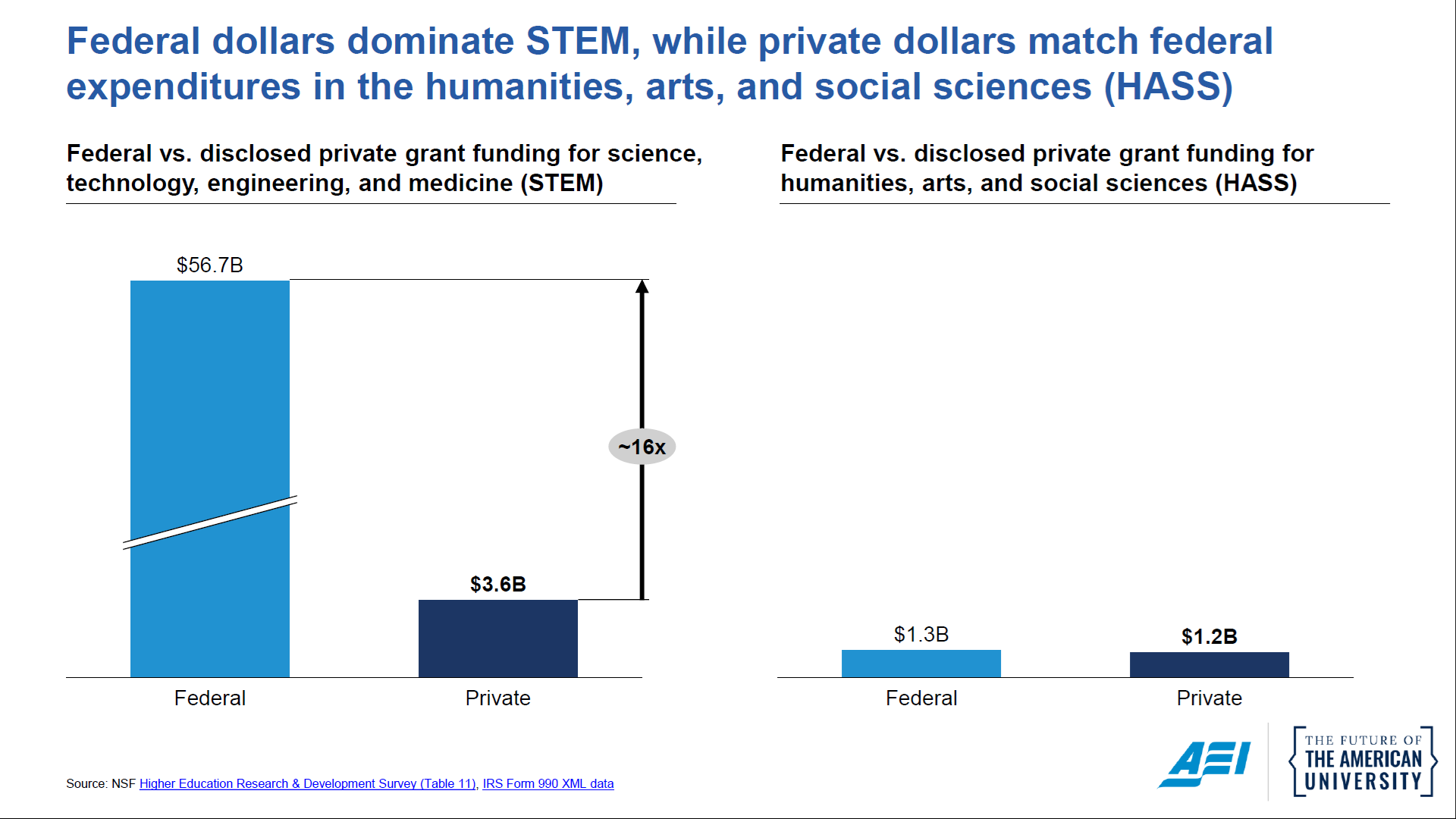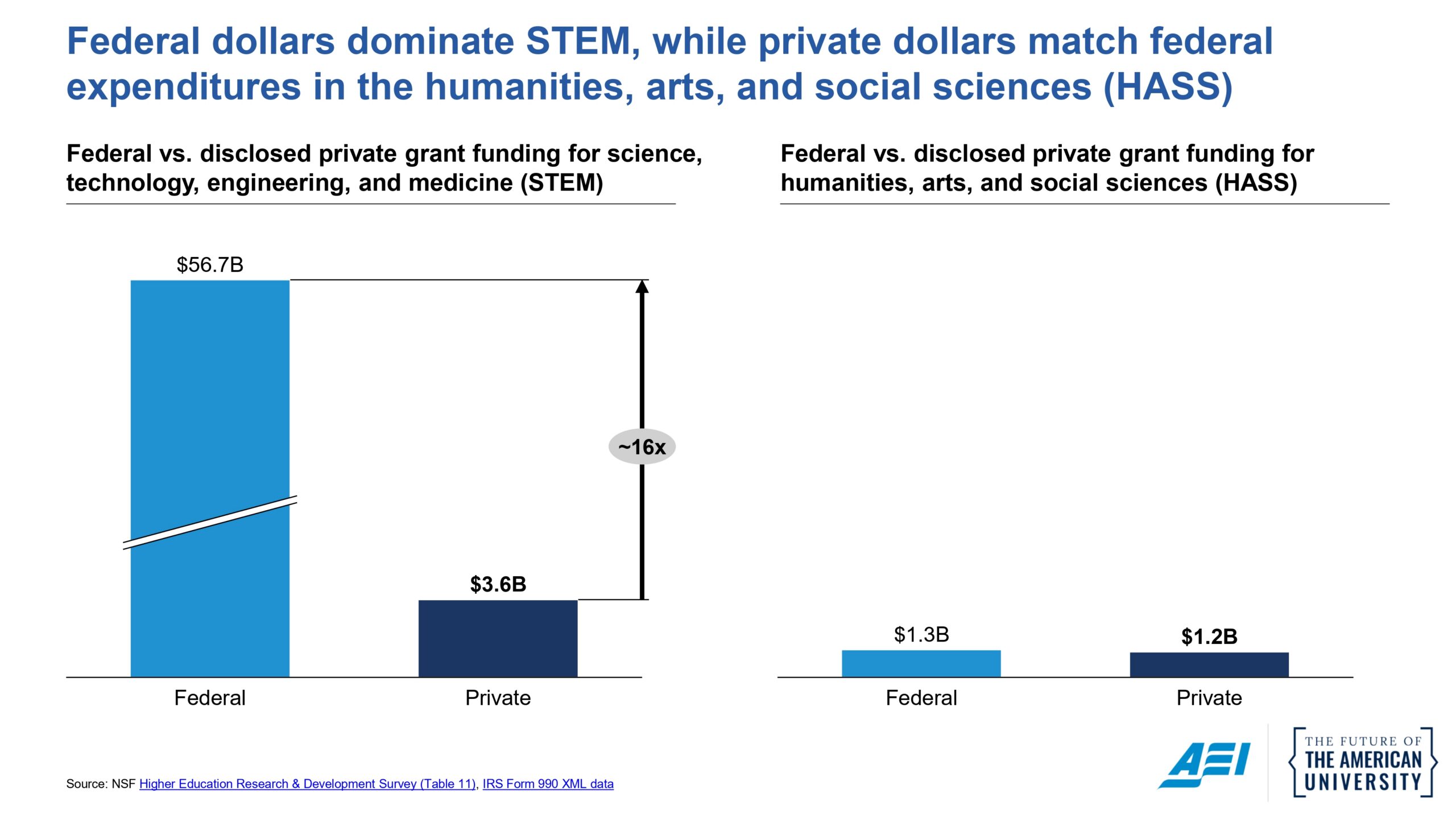 This scarcity flips the normal funding dynamics on their head. In STEM, federal agencies lead with abundant resources while private philanthropy follows; in HASS, private foundations lead while fragmented federal funding follows.