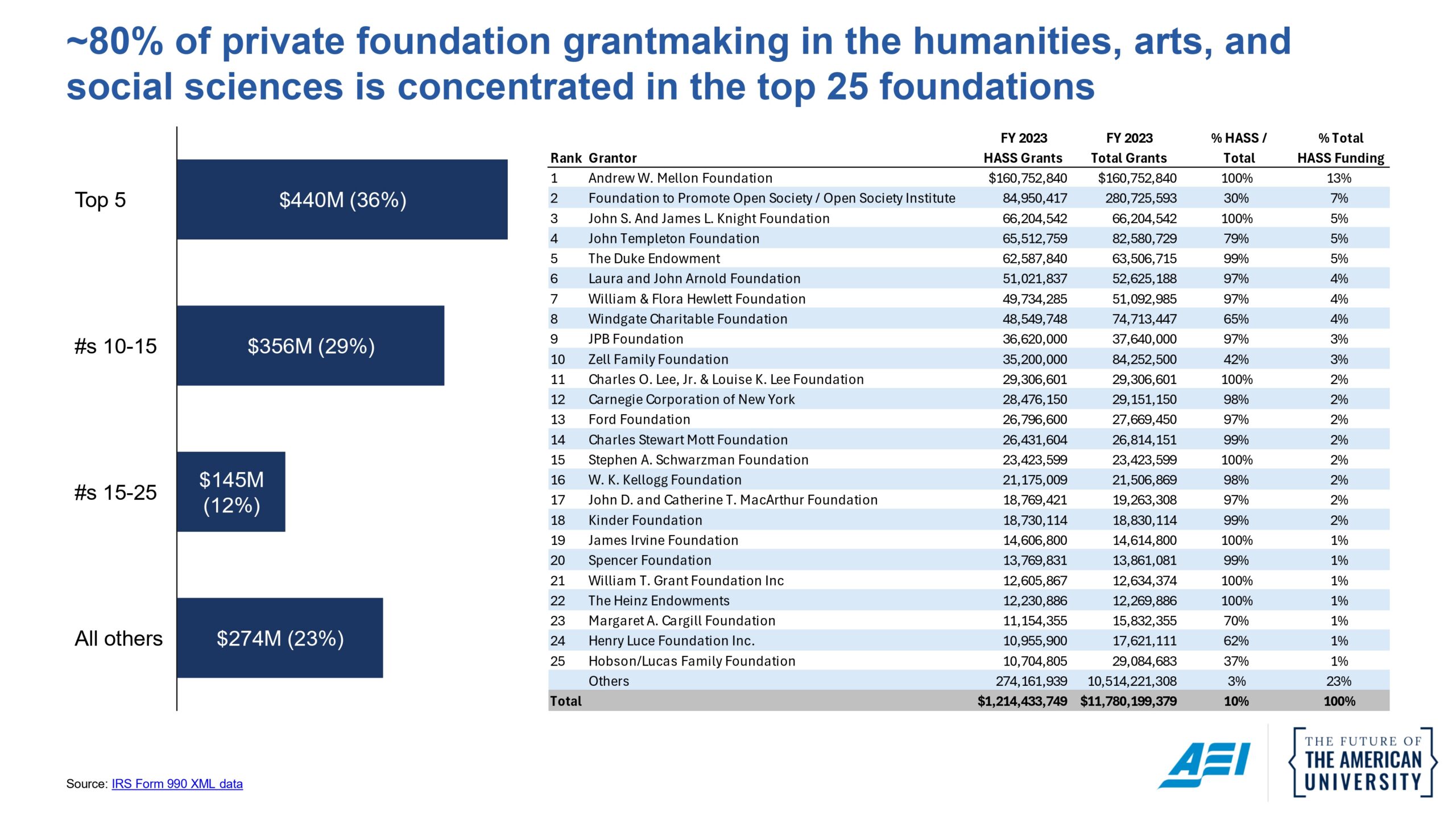 This scarcity is compounded by concentration. Nearly 80% of disclosed private funding for HASS fields comes from just 25 foundations. Many of the names are well-known: Mellon, Open Society, Duke, Knight, and Ford.