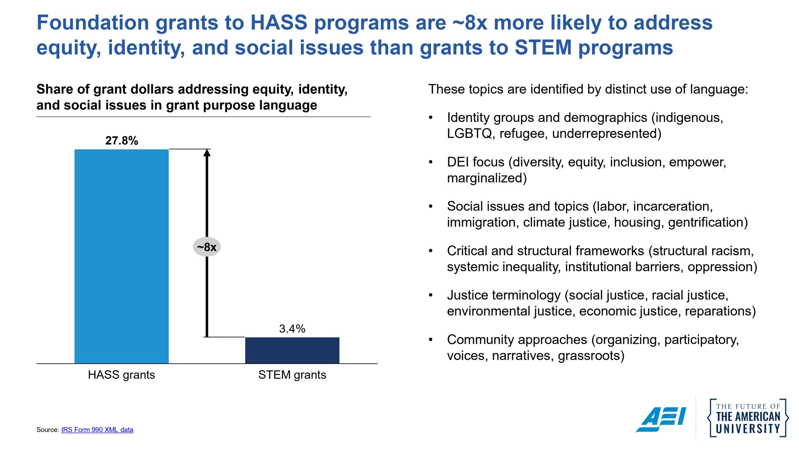 So, what can we discern about the favored topics of the standard-setting foundations? Analysis of HASS grant language using approximately 160 keywords (e.g., equity, identity, social justice) across six themes reveals that progressive topics appear at rates eight times higher than in STEM grants (27.8% vs 3.4%). Parallel analysis using approximately 180 keywords across eight themes typical of conservative scholarship (e.g., free markets, national security, limited government) found that negligible funding was granted in these areas.