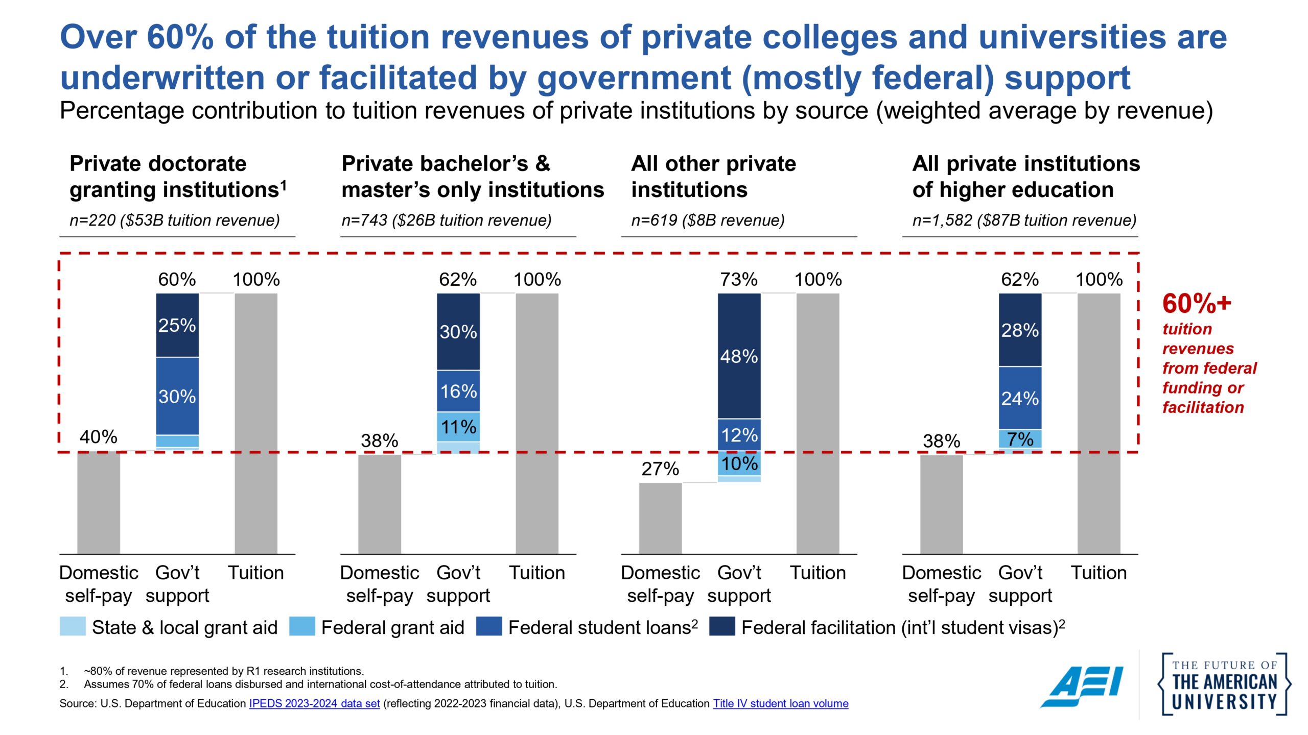 Not quite. Hillsdale is a small liberal arts college with no research enterprise, not a replicable counterexample for the national system of higher education. For most schools, financing through tuition is no refuge; 60% or more of private school tuition is funded or facilitated by government sources such as federal loans, grants, or the visa policies that bring in full-pay international students. In other words, public support comprises most of even what appears to be private revenue.