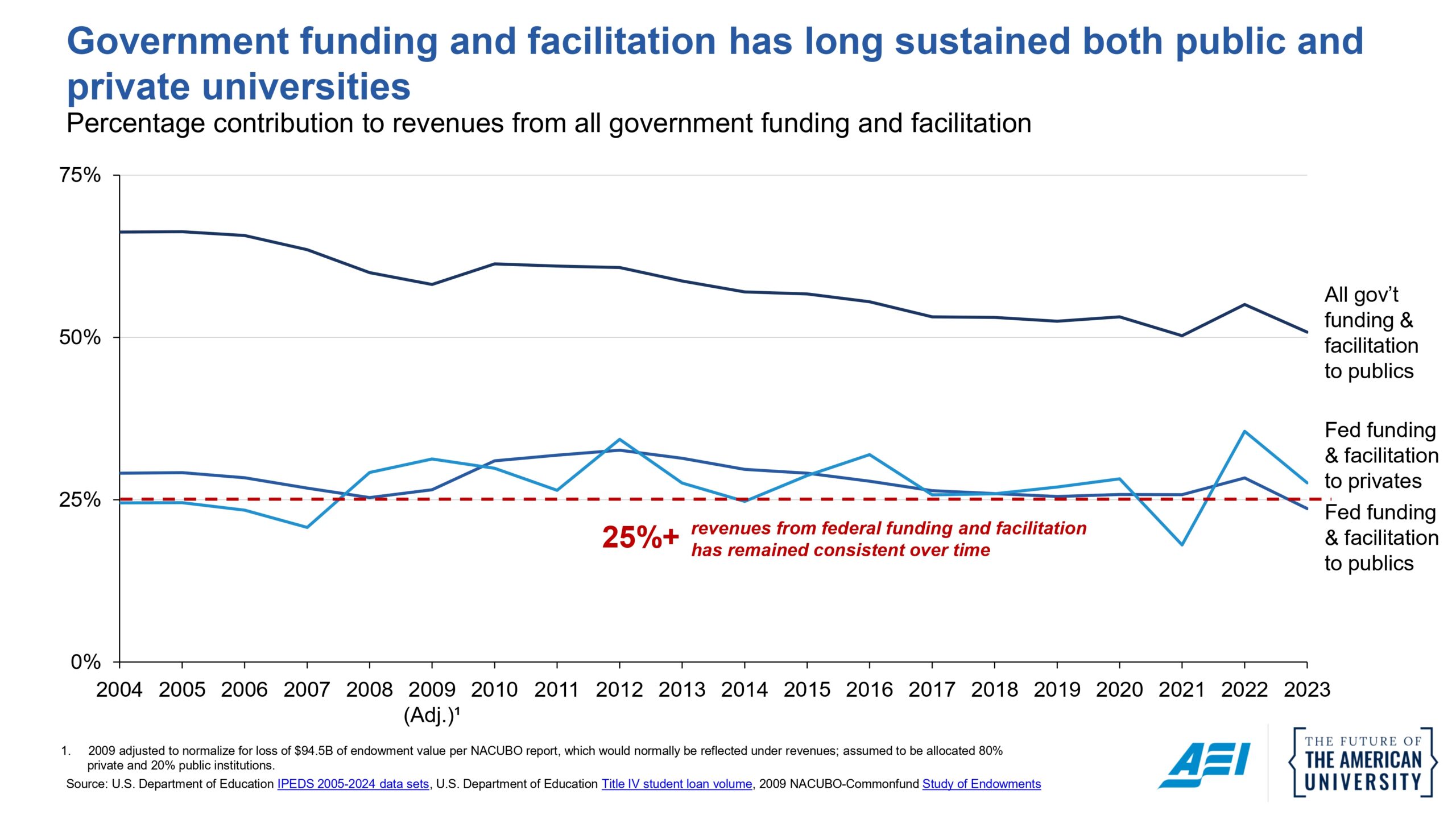 This is not a recent development. For decades, federal government support has quietly underwritten the entire system, regardless of whether universities are public or private. The chart below traces that steady reliance since 2004, which for both public and private institutions consistently hovers around the 25% mark.
